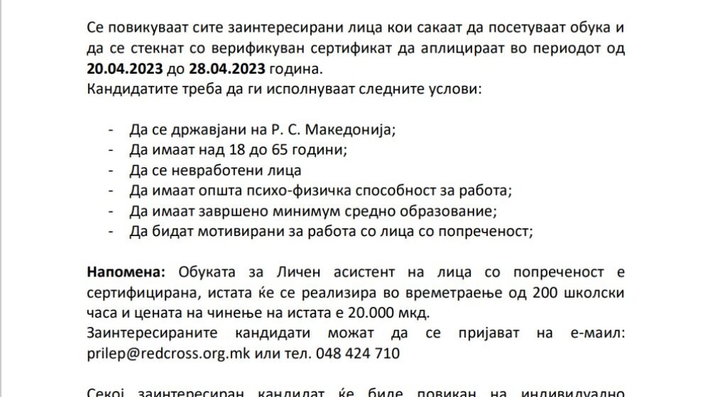 за обука на Личен асистент на лица со попреченост